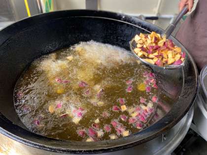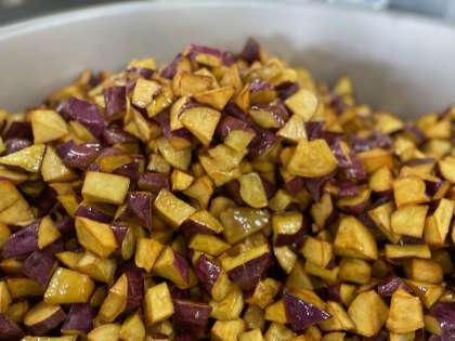 今日は給食では大学芋が大人気でした。徳島県産の鳴門金時を油でカラッと揚げて、甘辛い蜜をからめて作りました。
