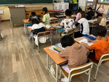 11月2日(木)3〜4時間目、1年1組は生活科で「学校たんけんパート2」を行いました。1学期に2年生に案内してもらった学校たんけんですが、半年たったので、自分の力で「わたしだけが知っている粉浜小学校」を見つけようとたんけんにでかけました。理科室で手が溶ける薬の入ったビンを見せてもらったり、放送室でいろいろな機械をはっけんしたり、給食室で調理をしている様子を見つけたりして、カードに絵や文でかいていました。発表もしっかりできるので半年での成長を感じました。