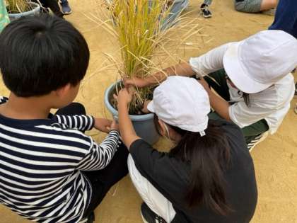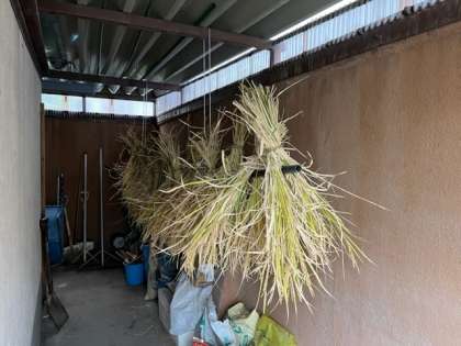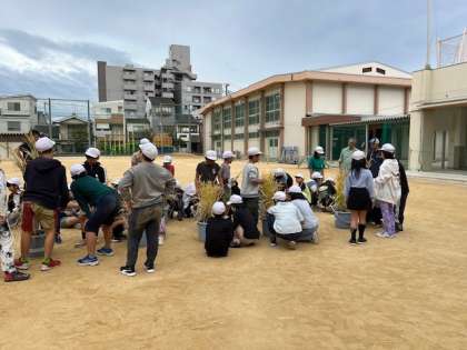 11月6日(火)1時間目、5年は総合で稲刈りをしました。刈った後の稲は道具倉庫で乾燥させています。