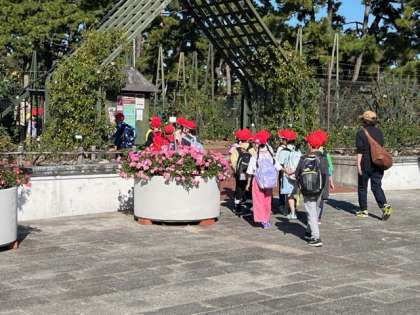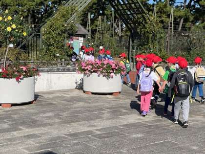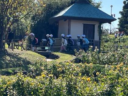 バラ園を抜けて日本庭園を楽しみました。どんぐりを拾っています。