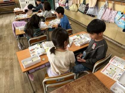 11月13日(月)4時間目、1年1組は図工で「でこぼこ はっけん!」を学習していました。粘土にでこぼこをつけて、隣の子に説明していました。「ぼくにも言わせて」と説明を楽しんでいました。