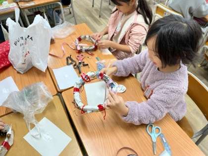 11月15日(水)1時間目、1年1組は生活科でアサガオのつるを利用してリースを作っていました。