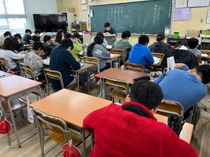 11月17日(金)1時間目、6年2組は国語で「ヒロシマのうた」を学習していました。先生の範読を聞いて、内容をつかもうとしていました。