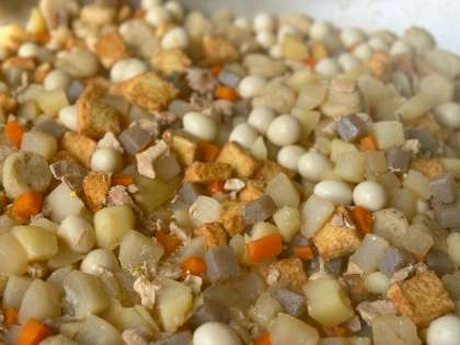 鶏肉、・大根・じゃがいも・にんじん・こんにゃく・厚揚げ・ごぼう天・うずら卵が入っていました。だしにいろいろな食材のうまみが出ていて、とてもおいしかったです。