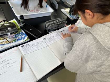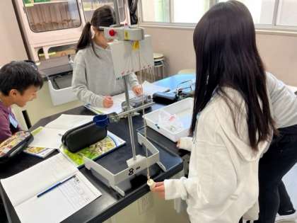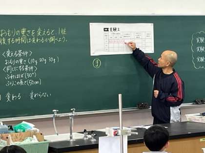 11月21日(火)3時間目、5年1組は理科で「ふりこのきまり」を学習していました。おもりの重さを変えてふりこの1往復の時間は変わるか調べていました。
