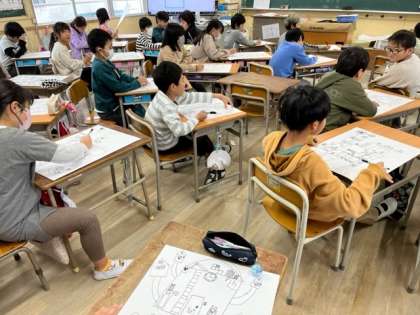 11月27日(月)4時間目、3年1組は図工で画用紙を縦にして木の上の「私の家」を描いていました。