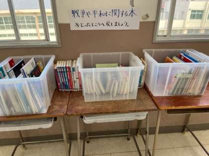 廊下には「戦争や平和に関する本」が並べられていて子どもたちは休み時間等に手に取って読んでいました。