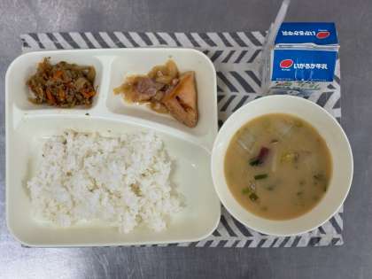 寒くなる時期に、風邪をひかず、体をあたため、元気にすごせるように考えて作られた献立です。きんぴらごぼうは、ラー油を使ってピリッとさせています。さつまいもみそしるは煮干しでとった出汁を使いました。