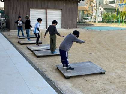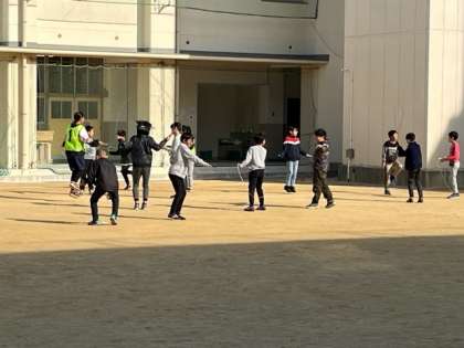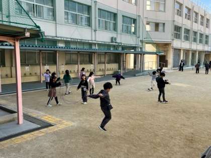 11月29日(水)業間(20分休み)は、我先にとなわとびを持って運動場へ出てきます。ジャンピングボードを使って二重跳びを練習する子もいれば、友だちと一緒に数多く跳ぼうとしている子もいました。