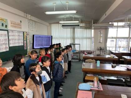 11月29日(水)3時間目、4年1組は音楽で「茶色のこびん」を鍵盤ハーモニカで合奏した後、「もみじ」の二部合唱を聞かせてくれました。上下の声が響き合っていました。