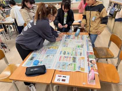 11月30日(木)1時間目、4年1組は算数で班ごとに1平方メートルの広さを新聞紙で作っていました。