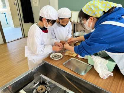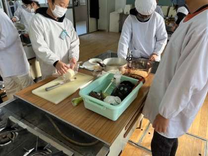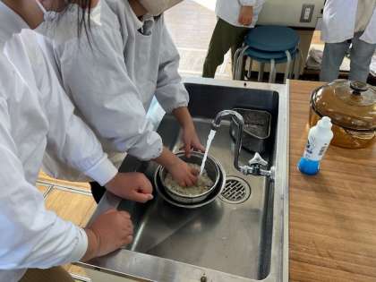12月4日(月)1時間目、5年2組は家庭科で「ごはんとみそ汁」の調理実習をしていました。米とぎをしていた子に、家でもしているかを聞いたところ、「していません。」と答えが返ってきました。みそ汁は、にぼしから出汁をとっていました。