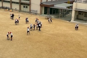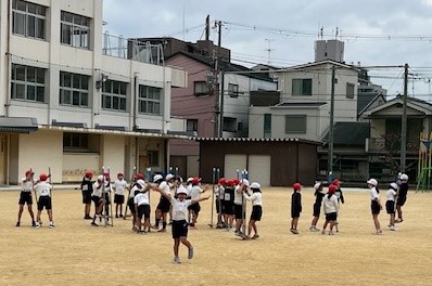 12月5日(火)3時間目、2年1組は運動場で竹馬をしていました。