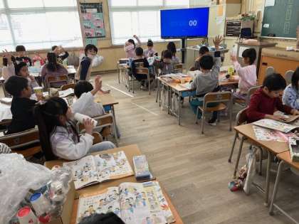 12月8日(金)3時間目、1年1組は生活科でどんなおもちゃを作ったかを発表していました。