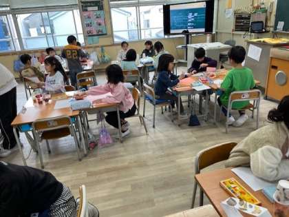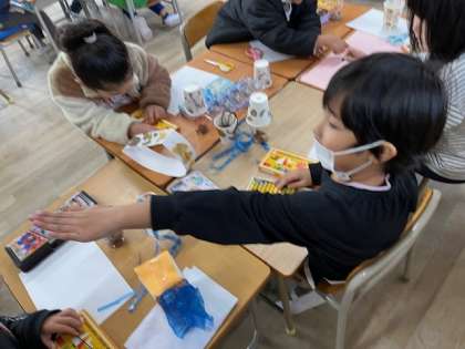 12月11日(月)1時間目、1年1組は生活科で「あきのおもちゃランド」の準備をしていました。看板を作ったり、遊び方の説明をしたり、遊びの見本を見せたりする準備や練習をしていました。