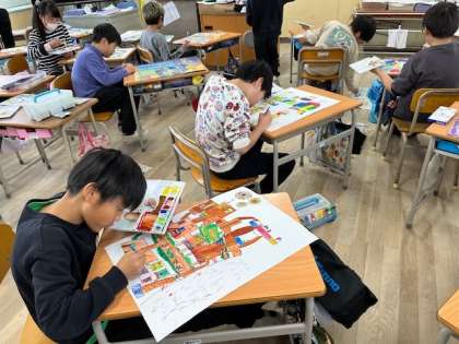 12月12日(火)4時間目、3年1組は図工で木の上にある不思議な家に色を塗っていました。