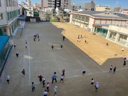 12月18日(月)2時間目、1年は体育でタグ(しっぽ)をとられないように、玉を運ぶゲームをしていました。それが終わってかけ足なわとびを練習していました。