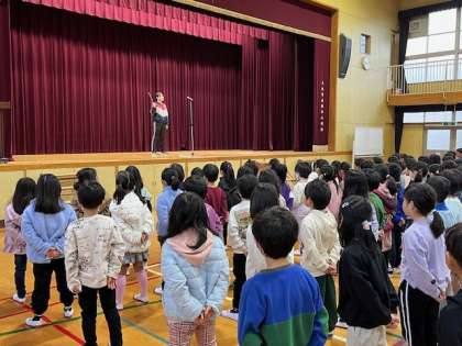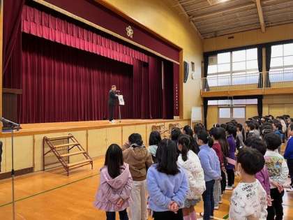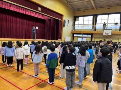 能登半島地震のお話をし、黙とうを捧げた後、読書感想文の表彰を行いました。元気な子供たちの顔を見て、また校歌の歌声を聞いて安心するとともに、いよいよ始まるなあと思いました。