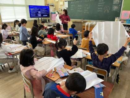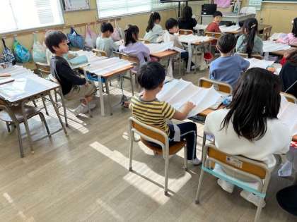 1月12日(金)4時間目、1年2組は生活科で凧作りをしていました。凧の裏表を手触りで見つけて、表にお正月の絵を描くところでした。