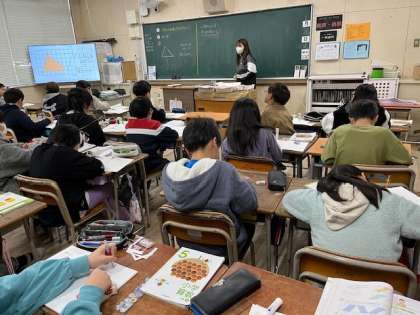 1月16日(火)1時間目、5年2組は算数で三角形の面積の求め方を考えていました。