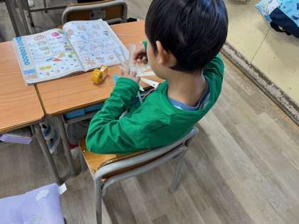 1月17日(水)1時間目、1年1組は生活科でかみとんぼを作っていました。紙コップを切って作っていました。
