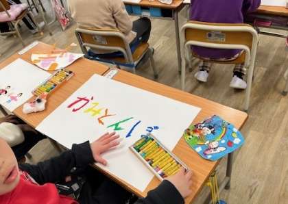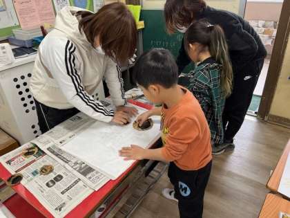 1月23日(火)1時間目、1年1組は版画を刷りながら、ワクワクどきどきフェスティバルの看板等を作っていました。
