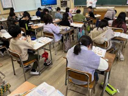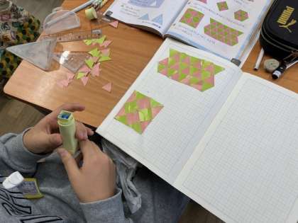 1月24日(水)1時間目、3年2組は算数で形も大きさを同じ二等辺三角形や正三角形をしきつめてできるもようを作っていました。