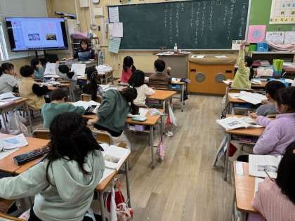 1月26日(金)1時間目、1年2組は国語で「子どもを まもる どうぶつたち」を学習していました。オオアリクイについて調べていました。