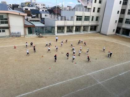 1月29日(月)3時間目、3年2組は体育で腰にタグをつけてしっぽとりをしていました。二人組から、取るタグの色を決めると、子どもたちが入り乱れて動き始めました。この動きがタグラグビーにつながるのですね。