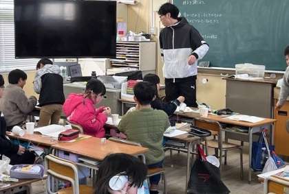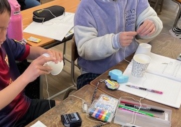 2月9日(金)1時間目、3年2組は理科で音が伝わっている時の様子を調べるため、糸電話を作っていました。