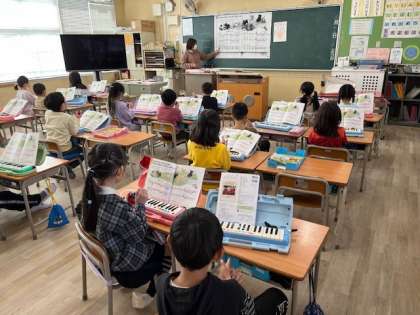2月13日(火)4時間目、1年1組は音楽で「こいぬの マーチ」を鍵盤ハーモニカで練習していました。