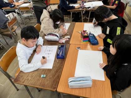 2月16日(金)1時間目、3年2組はこの一年で心に残っていることを画用紙に書いていました。