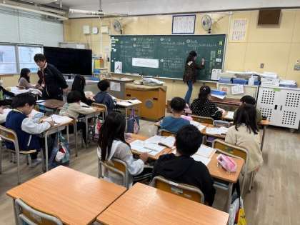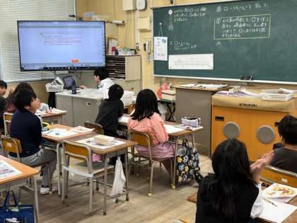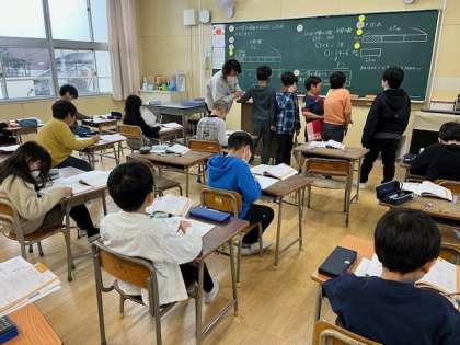 2月19日(月)2時間目、3年は算数で学年を3分割して学習していました。□を使って、場面を式に表し、□の求め方を考えていました。