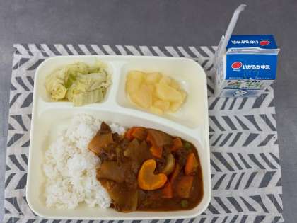 ・ごはん ・牛乳 ・ハヤシライス ・キャベツのバジル風味サラダ ・洋ナシ(カット缶)