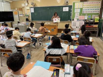 2月26日(月)3時間目、1年1組は国語で「スイミー」を学習していました。スイミーが見た「おもしとい もの」の中から好きなものを選んで様子を書いていました。