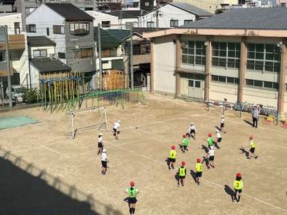 2月27日(火)1時間目、4年2組は体育でサッカーをしていました。