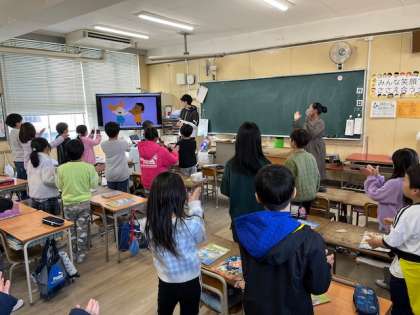 2月28日(水)1時間目、3年2組は外国語活動で、幸せなら手をたたこうを英語でうたに合わせて楽しんでいました。