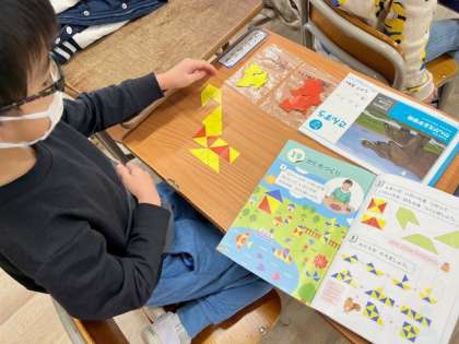 2月29日(木)1時間目、1年1組は算数で「かたちづくり」を学習していました。三角形を使っていろいろな形を作っていました。