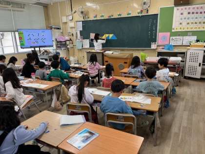 2月29日(木)1時間目、1年2組は算数で「かたちづくり」を学習していました。2色の三角形を動かして形を変えていっていました。