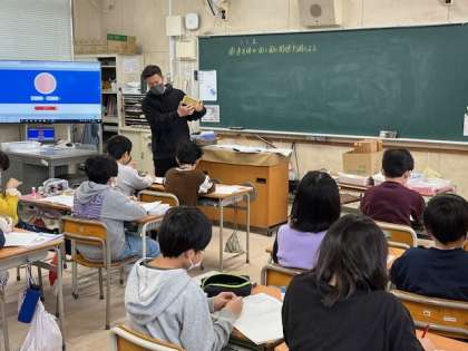 3月1日(金)1時間目、4年2組は算数で直方体の面と面の関係を調べていました。自分で作った直方体にア、イ、ウと記号を書いていました。
