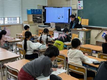 3月1日(金)5時間目、2年1組は国語で、先生が教科書をモニターに映しながら話すと、おもしろいのか子どもたちは笑いながらノートに書いていました。