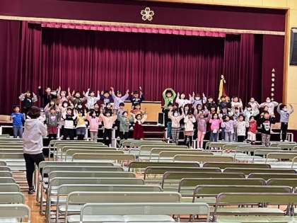 3月8日(金)4時間目、講堂からかわいらしい元気な歌声が聞こえてくるので見にいきますと、1年生が入学式で新1年生に映像で見せる演技の練習をしていました。「世界中の子どもたちが」を上手に歌っていて、楽しい気持ちになりました。