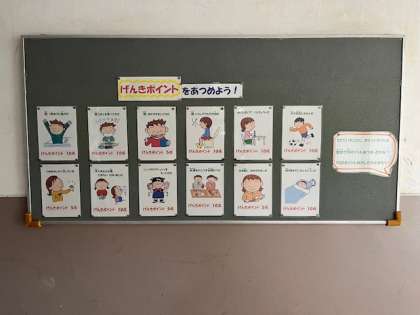 3月11日(月)保健室前の掲示板が「げんきポイントをあつめよう!」になっていました。みなさんは何点集められるでしょうか?