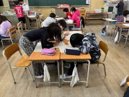 3月11日(月)2時間目、3年2組は国語で外国について調べ、まとめようとしていました。班で協力していますが、できてきたのでしょうか。