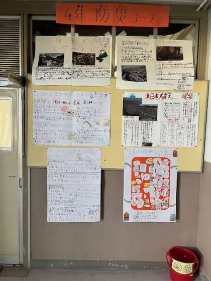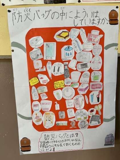 3月15日(金)4年は総合的な学習の時間で調べてまとめてきた「防災」について理科室前の掲示板を使って発表しました。2学期に取り組んだものの一部だと思いますが、しっかり調べていました。朝から、見てもらえるように放送でアナウンスする人もいました。能登半島地震、東日本大震災、阪神淡路大震災について調べただけでなく、南海トラフ巨大地震についても調べていました。特に「防災バッグの中に用意はしていますか」が役に立ちそうなので、多くの人に見てほしいと思いました。
