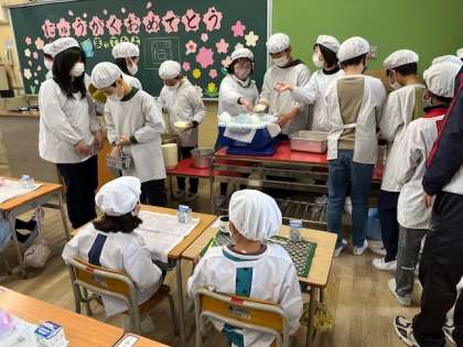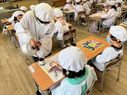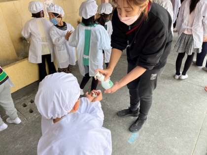 4月9日(火)1年生ははじめての給食でした。手洗い場で手を洗うのも練習です。6年生が給食を運んでくれ、配膳までしてくれました。