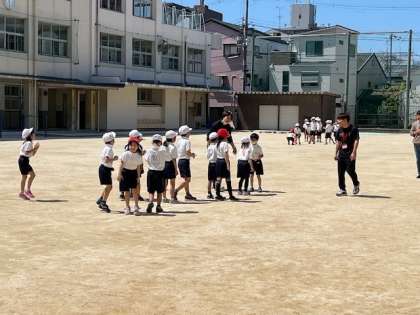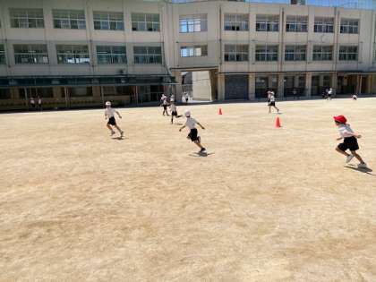4月10日(水)3時間目、2年は体育で準備運動におにごっこをしていました。その後、全身でするじゃんけんを使って2チームに分かれて自分の陣地から走って行ってじゃんけんをして負けたら次の人と替わるゲームをしていました。相手に陣地まで攻め込まれたら負けです。