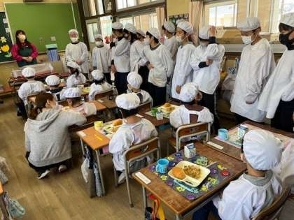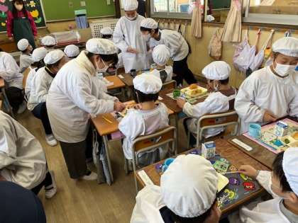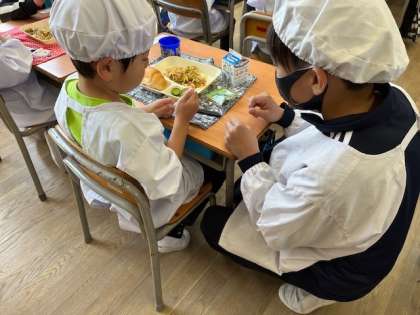 4月10日(水)1年2組の給食は6年2組が手伝ってくれました。1組と同じように6年生がストローの使い方を教えていました。