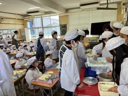 4月12日(金)給食で1年2組も6年生が頑張ってくれています。