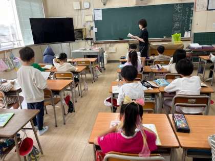 4月15日(月)1時間目、2年1組は国語で「風の ゆうびんやさん」の音読をしていました。